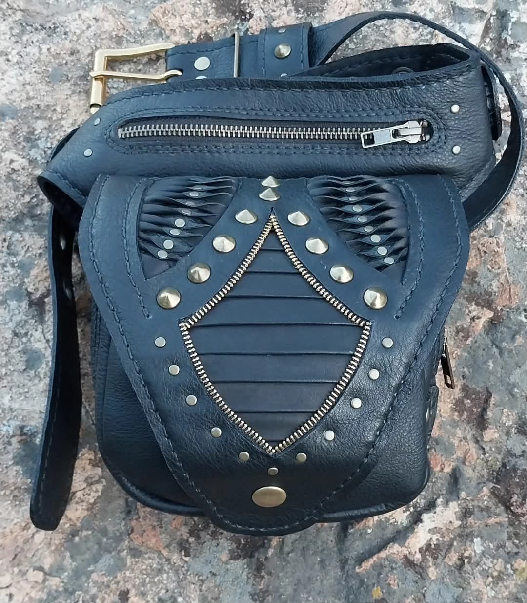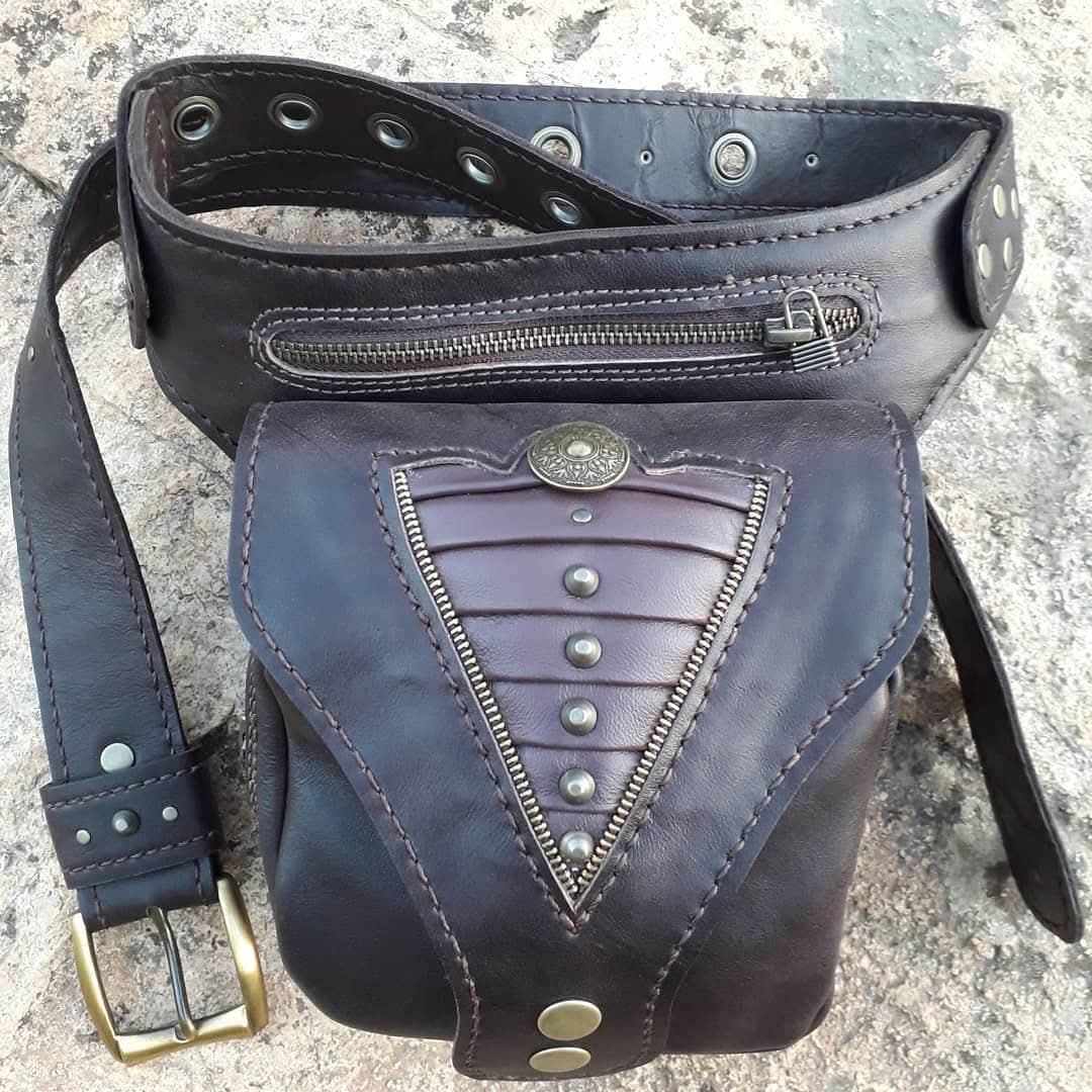 Diseño cuenta con las piezas forradas y cosidas, cinturón de 4 cm. de ancho con hebillas de bronce y cierres de alta calidad (YKK), en la base de frente y atrás tiene dos bolsillos con cierres (YKK), más dos sacos uno abierto y otro cerrado con cierre.
